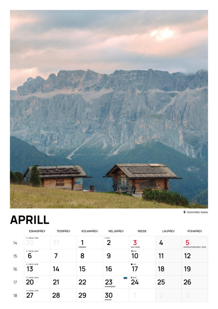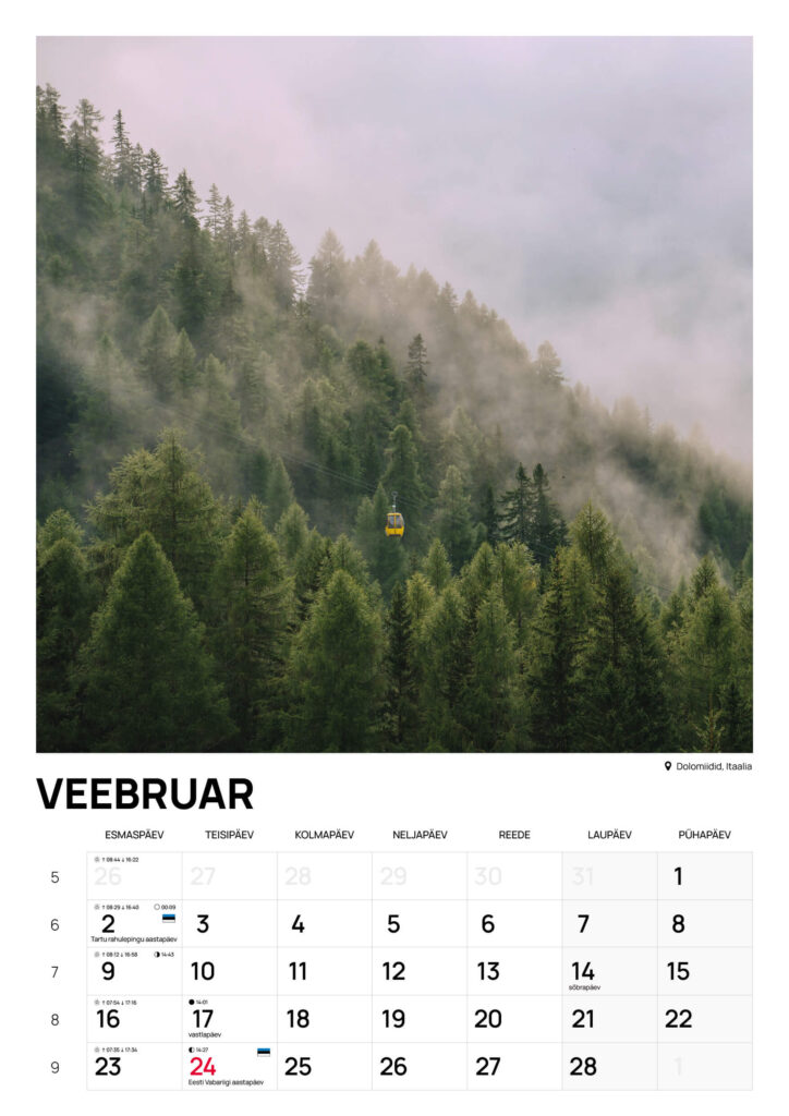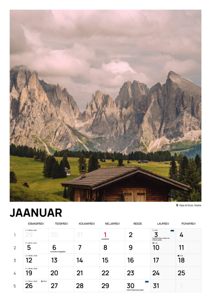Riputatav A3 suuruses seinakalender 2026 on nüüd saadaval. Suured fotod, selged kuupäevad ja kõik olulisemad Eesti tähtpäevad teevad sellest praktilise ja samas kauni lisandi igasse koju või kontorisse.